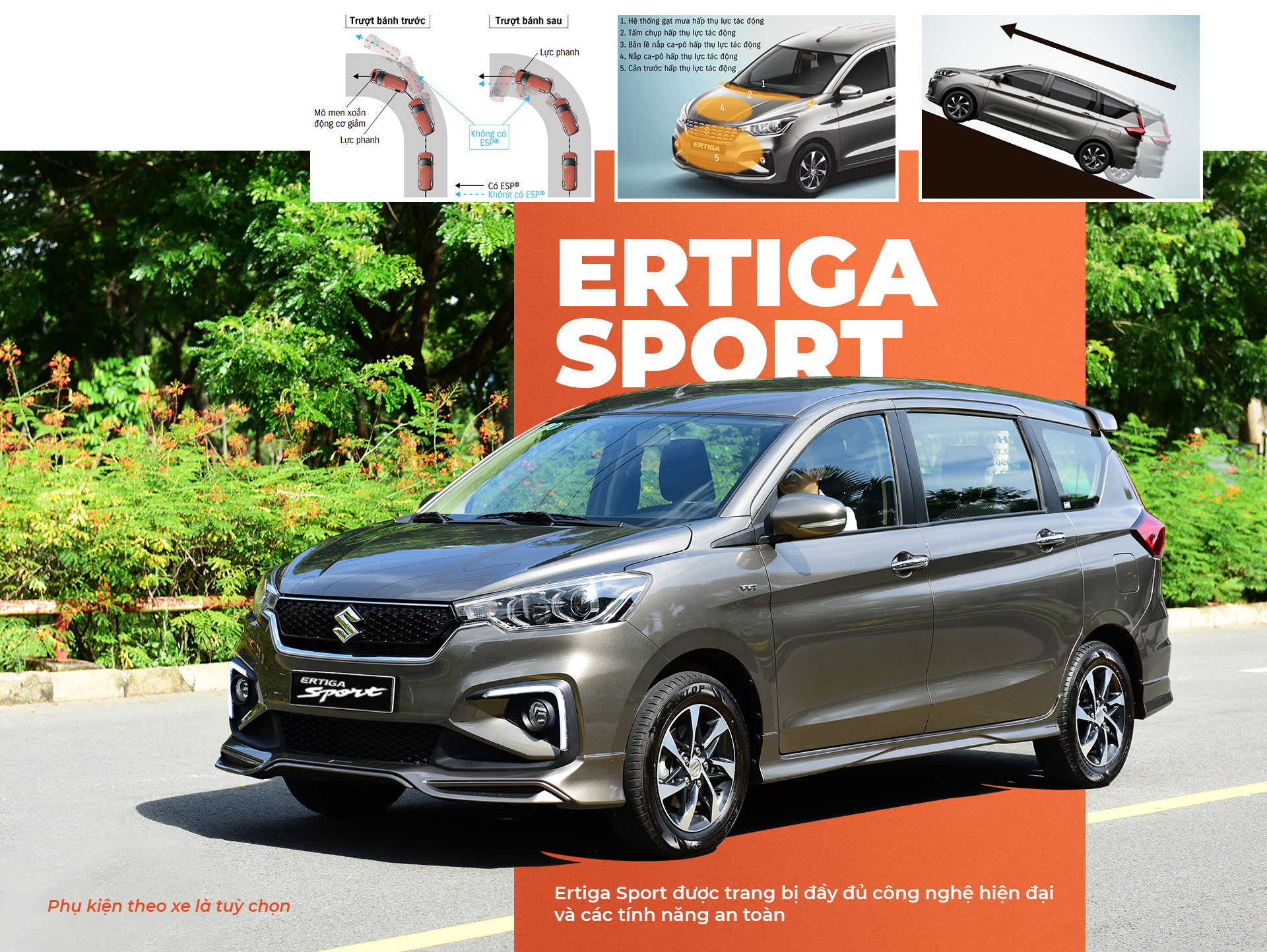 Suzuki đảm bảo trên những mẫu xe như XL7 hoàn toàn mới, Ertiga Sport đều được trang bị các công nghệ an toàn như: cân bằng điện tử (ESP®), khởi hành ngang dốc (HHC), camera lùi và cảm biến đỗ xe, hệ thống chống bó cứng phanh (ABS), phân phối lực phanh điện tử (EBD) và hỗ trợ lực phanh (BA), thân xe hấp thụ lực tác động nhằm giảm thiểu chấn thương cho người đi bộ trong trường hợp xảy ra va chạm (PIMB).